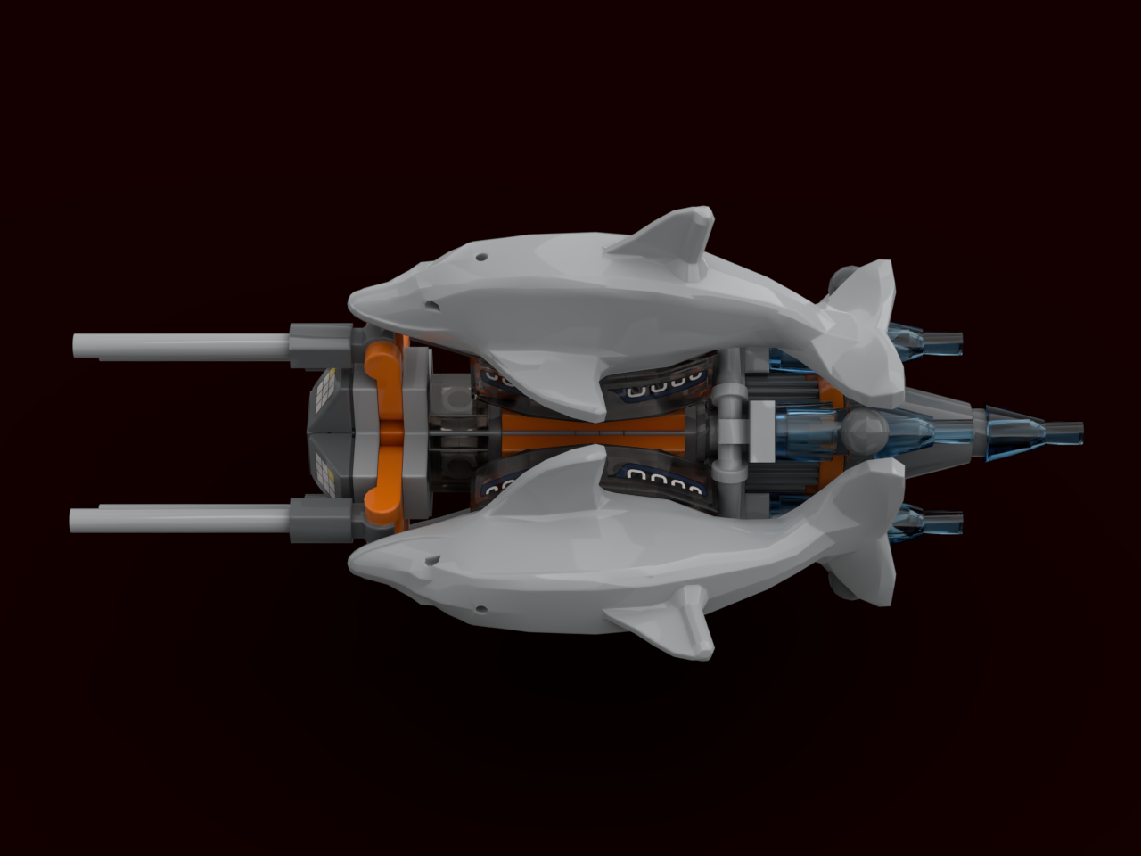 При размышлении о дизайне космического корабля, среди прочих меня посетила мысль применить фигурки каких-то животных. Был вариант с коняшками, как заслуженными "тягачами" человеческой цивилизации, но в итоге за плавность линий, стремительность и аэродинамику (хотя в атмосфере он скорее всего использоваться не будет) был выбран дельфин.