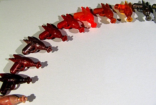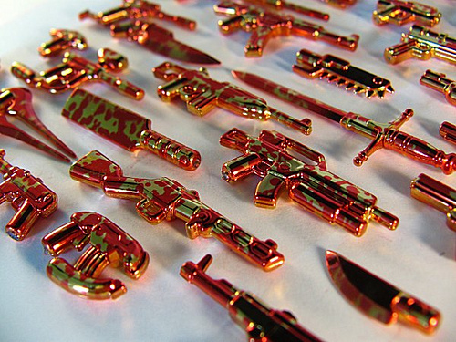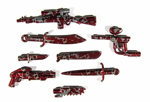 It contains 4 items. There is an assortment of colors for each item, including 24K gold ray guns, tactical swords, and blood-spattered weapons. Also, there is a 1:100 chance of receiving a prototype BrickArms weapon in addition to the regular items. The breakdown is a follows: • 1 Ray Gun Gold (1:100) Ruby Red Chrome (1:8) Midnight Blue Chrome (1:8) Bright Chrome (1:8) Black Chrome (1:8) Glow-in-the-Dark (1:8) Mystery Solid (1:2) • 1 Tactical Sword Gold (1:100) Ruby Red Chrome (1:8) Midnight Blue Chrome (1:8) Bright Chrome (1:8) Black Chrome (1:8) Glow-in-the-Dark (1:8) Mystery Solid (1:2) • 1 Blood-spattered Weapon Assorted Gold (1:100) Titanium Combat Knives (1:4) Titanium Paintball Guns (1:5) Titanium Machete (1:20) Titanium Chainblades (1:10) Titanium Combat Shotguns (1:8) Titanium M21 Snipers (1:8) Titanium Damien Blades (1:25) Titanium Dadao (1:16) • 1 Minigun Glow in the Dark (1:10) Solid Lego Green (1:10) Solid Lego Red (1:10) Solid Lego Blue (1:10) Bronze (1:10) Assorted Mystery Metallics (1:2) + 1 Rare Proto (1:100)