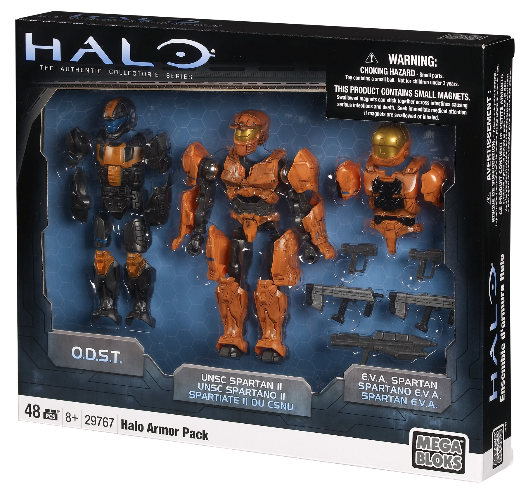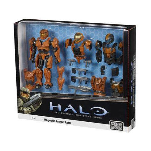 Mega Bloks Magnetic Armor Pack. With each passing day, the Covenant's stranglehold on the galaxy gets tighter. Utilize all of the UNSC's resources to combat the alien threat - activate your Spartan-II forces and team up with the Orbital Drop Shock Troopers to defend the outer colonies and humanity's place in the galaxy! The Halo Magnetic Armor Pack comes with three full sets of Orange UNSC battle armor and weapons to give you the opportunity to lead a task force into enemy territory. Lead the forces as a Spartan-II, engage Covenant forces in zero-gravity combat as a Spartan-II EVA, or go feet-first behind enemy lines on special missions as a member of the ODST! Each piece can fit over the included UNSC Skeletal Soldier capable of masterful flexibility and display. Build and combine pieces for customized units ready for any battle scenario! The deluxe blister packing lets you see every piece included with the Armor Pack, right down to the smallest details! The Mega Bloks Magnetic Armor Pack features:
