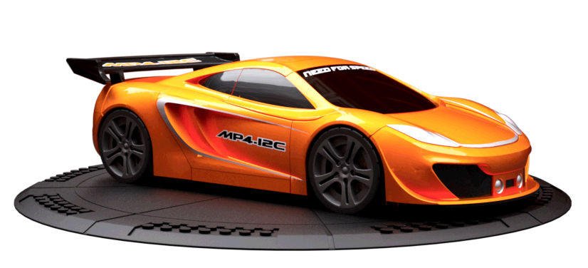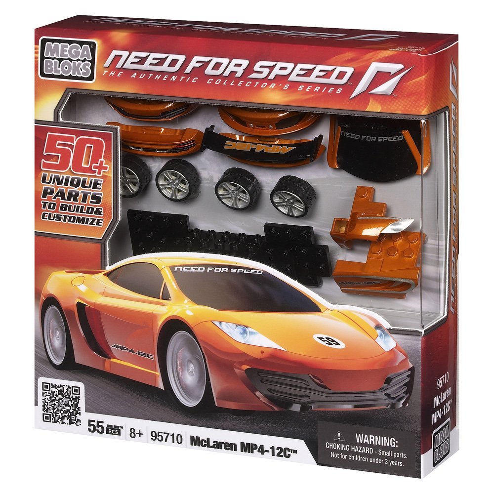 The MP4-12C contains a McLaren M838T twin-turbo 3.8 L V8 engine that can go from 0 to 124 mph in under 10 seconds! The MP4-12C is built using state-of-the-art Formula 1-sourced technologies that let you redline the engine to limits that would rip normal sports cars to pieces. This street legal racer is painted metallic orange with the car's name \\\"MP4-12C\\\" painted on the doors! Customize your McLaren MP4-12C with cool interchangeable alternate front and rear spoilers to make your ride truly unique! Build, play and display your McLaren MP4-12C for the whole racing world to see! Do you have the Need for Speed? Features: Buildable custom scale 1:38 McLaren MP4-12C Includes interchangeable front and rear spoilers