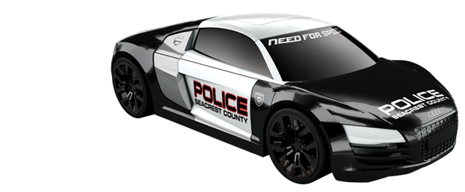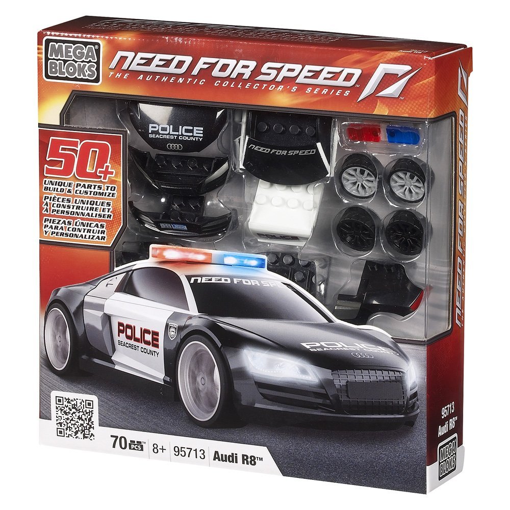 Customize your Mega Bloks Need for Speed Build and Race Vehicle - Audi R8 with cool interchangeable parts like an alternate police lights or jet black street rims to make your ride truly unique! Build, play and display your Audi R8 Police Cruiser for the whole racing world to see! The Audi R8 Police Cruiser is one of the most awesome police cars to ever take part in a police pursuit! Build the Audi R8 with its 5.2-liter V10-powered engine with 518 horsepower and 391 lb/ft. of torque and rip up the roads of Seacrest Valley as you chase down the bad guys! This awesome Audi R8 is painted is painted in black and white police colors and decals. The Mega Bloks Need for Speed Build and Race Vehicle - Audi R8 features: *Buildable custom scale 1:38 Audi R8 Police Cruiser *Includes interchangeable custom police lights and thin-spoke black rims