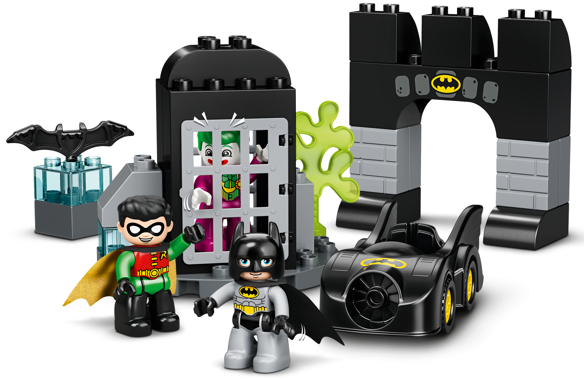 | 1 X Duplo, Brick 2 x 8 x 2 Arch with Stonework and Black Bat on Yellow Background Batman Logo Pattern | Black |   |  |