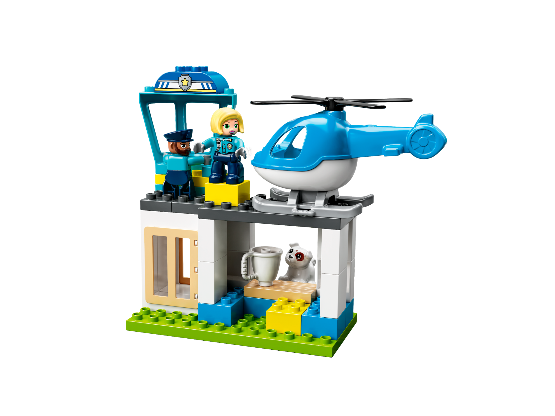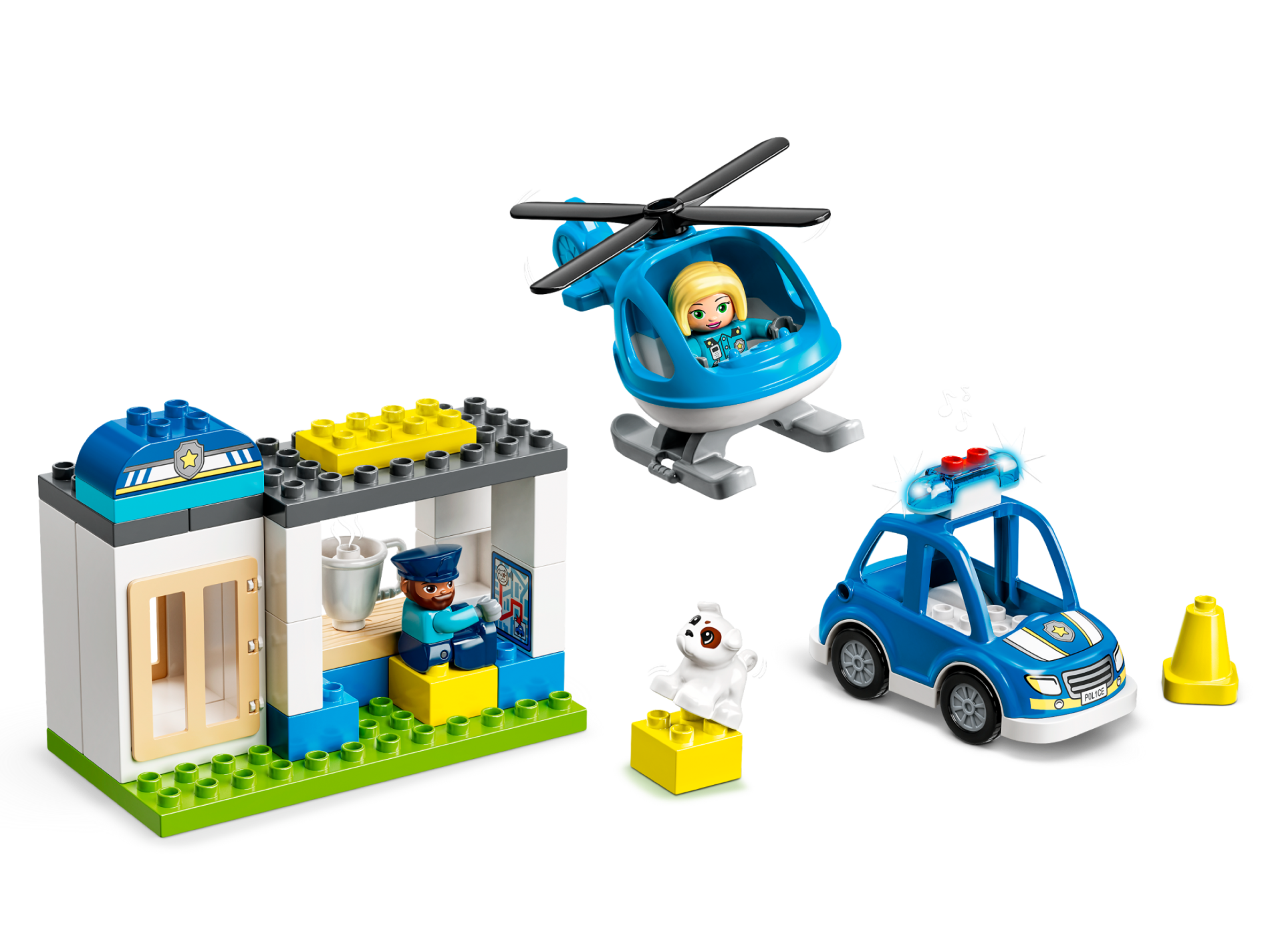 | 1 X Duplo Car Body High Cab 2 Top Studs with Silver, White and Bright Light Yellow Headlights, Grille, Bumper, Badge with Star, and 'POL1CE' Pattern | Blue |   |  |