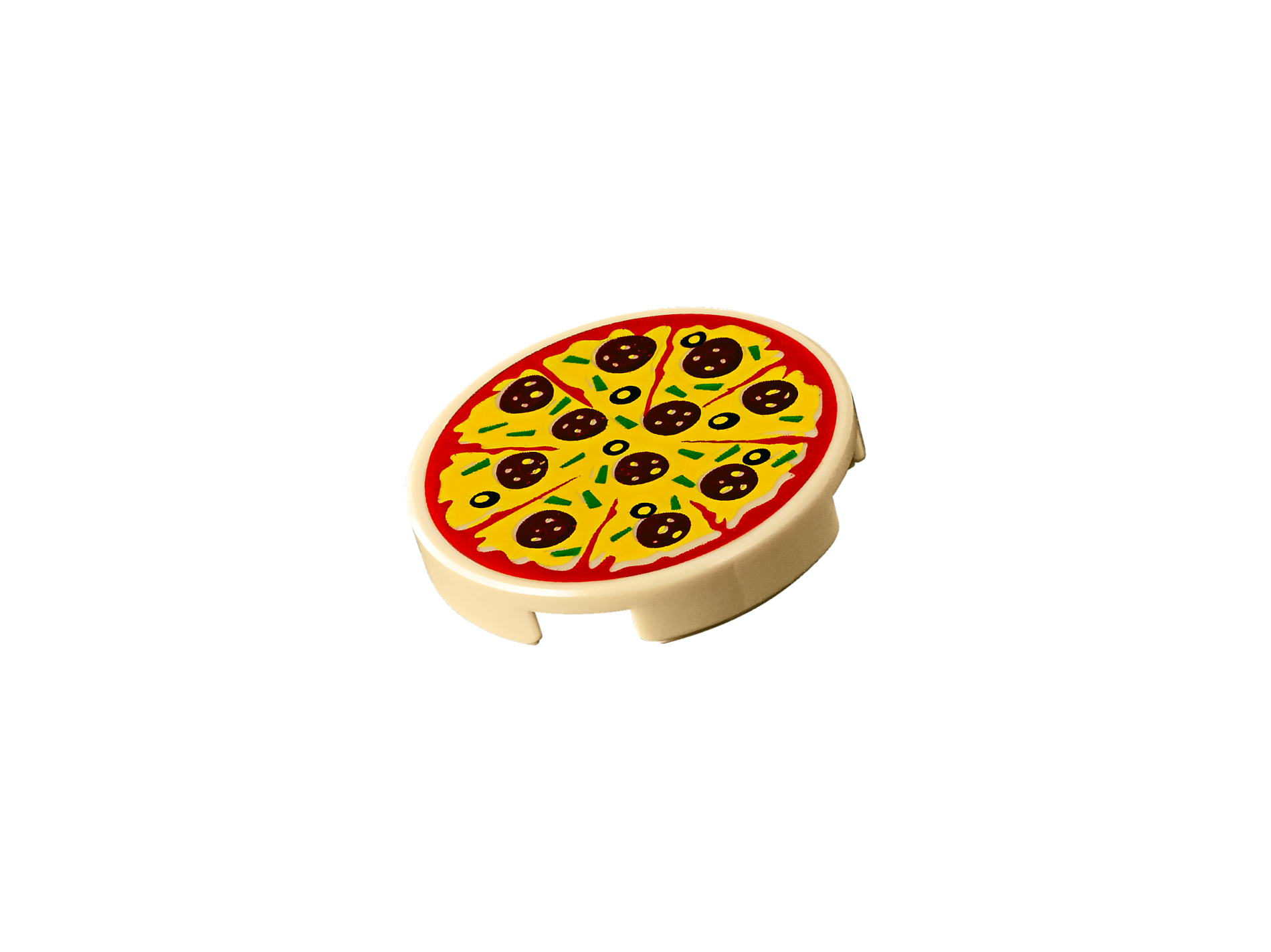 | 1 X Tile, Round 2 x 2 with Bottom Stud Holder with Pizza Pepperoni and Olive with Slice Marks Pattern | Tan |   |  |