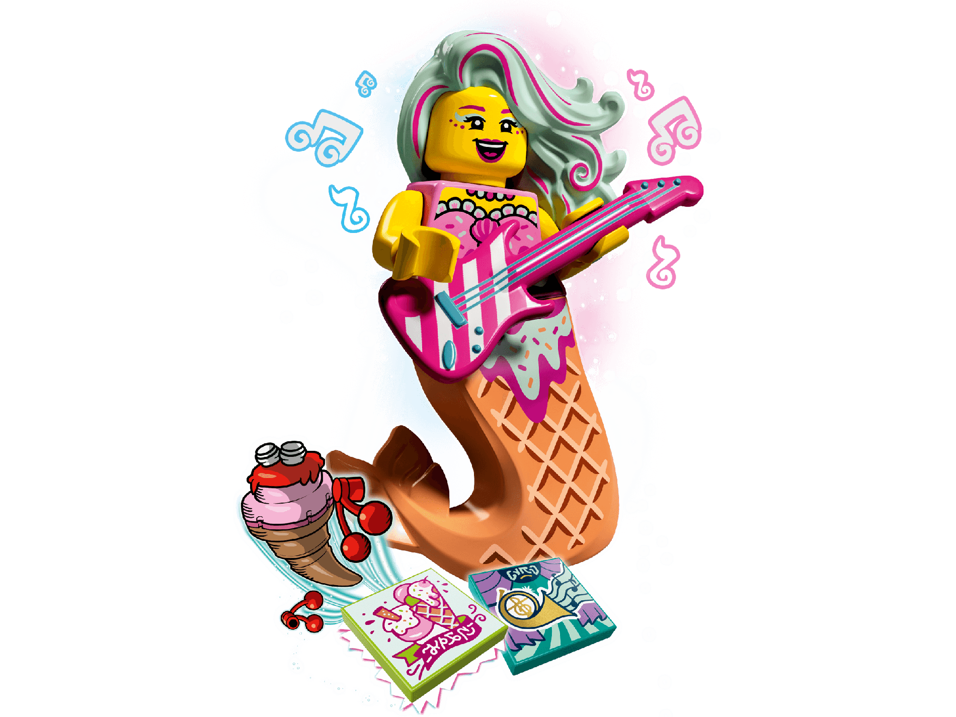 | 1 X Minifigure, Utensil Guitar Electric with White Diagonal Stripes and Metallic Light Blue Strings, Bridge and Output Jack Pattern | Dark Pink |   |  |