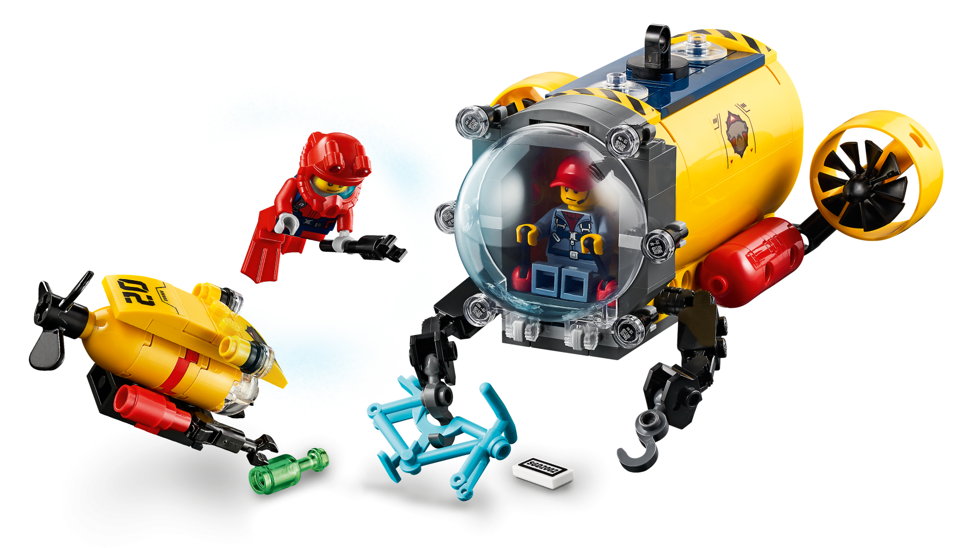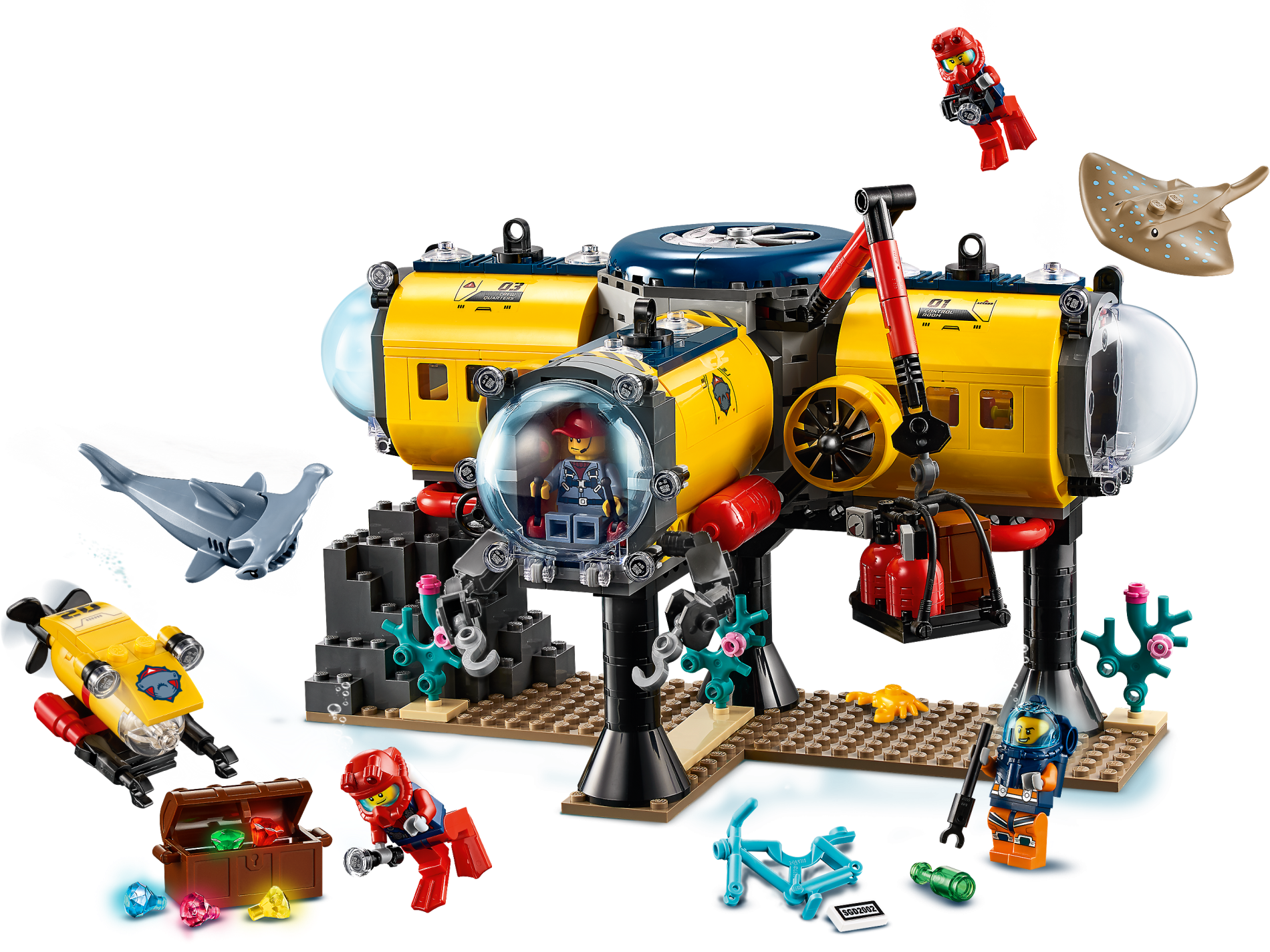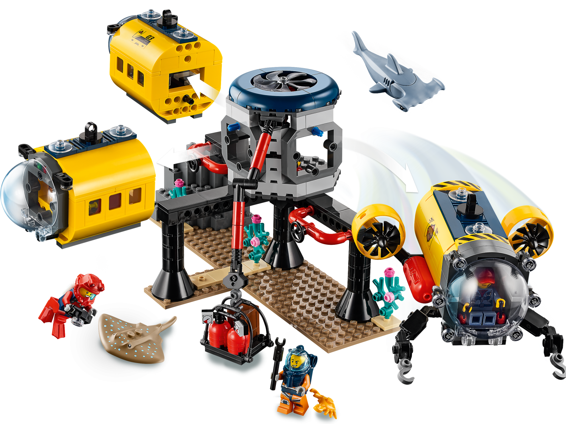 | 1 X Slope, Curved 6 x 8 x 2 Double with Hammerhead Shark Head, Black Lines and Red Arrows Pattern on Both Sides (Stickers) - Set 60265 | Yellow |   |  |