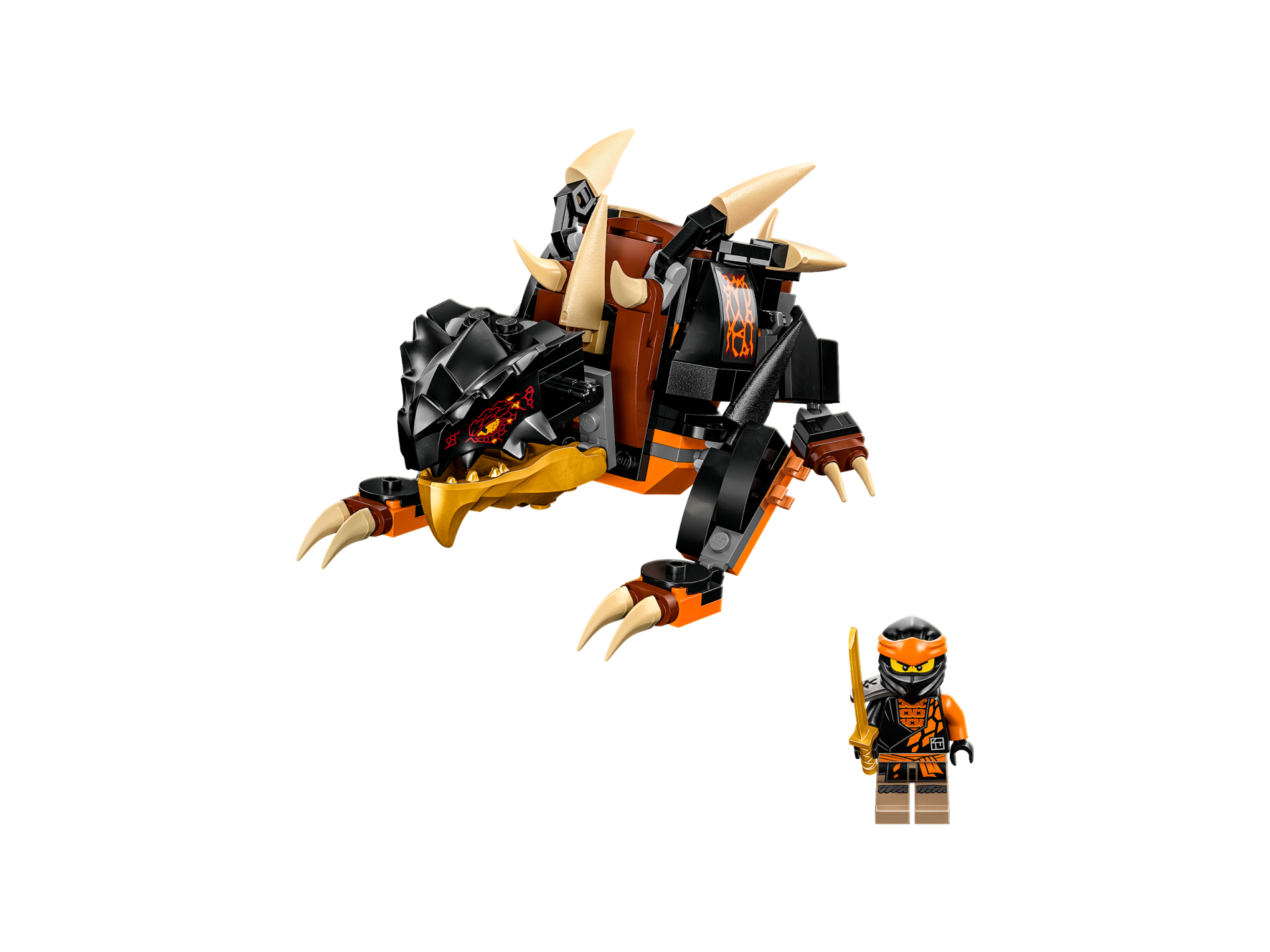 | 1 X Dragon Head (Ninjago) Jaw with Spikes, 8 Studs and 2 Bar Handles on Back with Bright Light Orange Eyes and Dark Red Scales Pattern | Black |   |  |