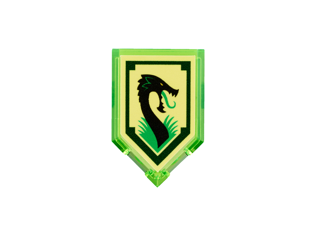 | 1 X Tile, Modified 2 x 3 Pentagonal with Nexo Power Shield Pattern - Jungle Dragon | Trans-Bright Green |   |  |