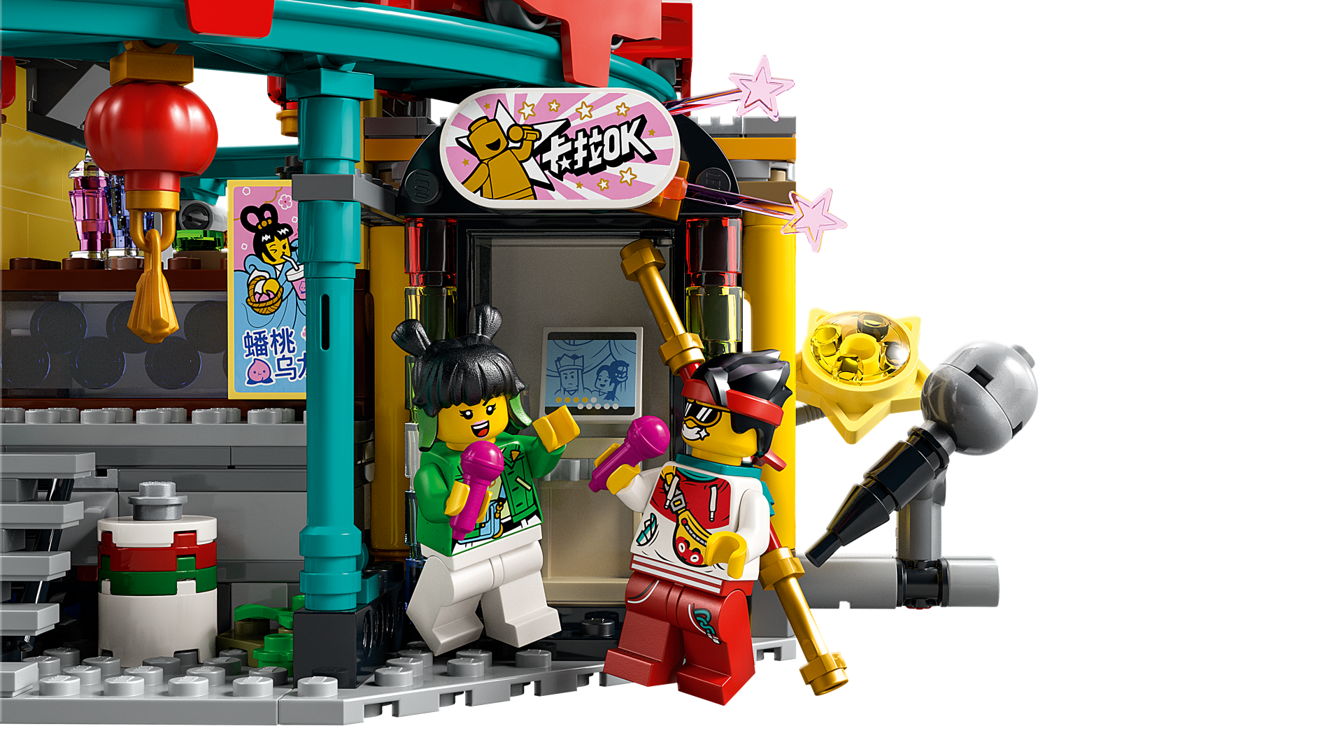 | 1 X Tile, Round 2 x 4 Oval with Gold Minifigure, Microphone, Stars, and White Chinese Logogram '卡拉OK' Pattern (Sticker) - Set 80036 | White |   |  |