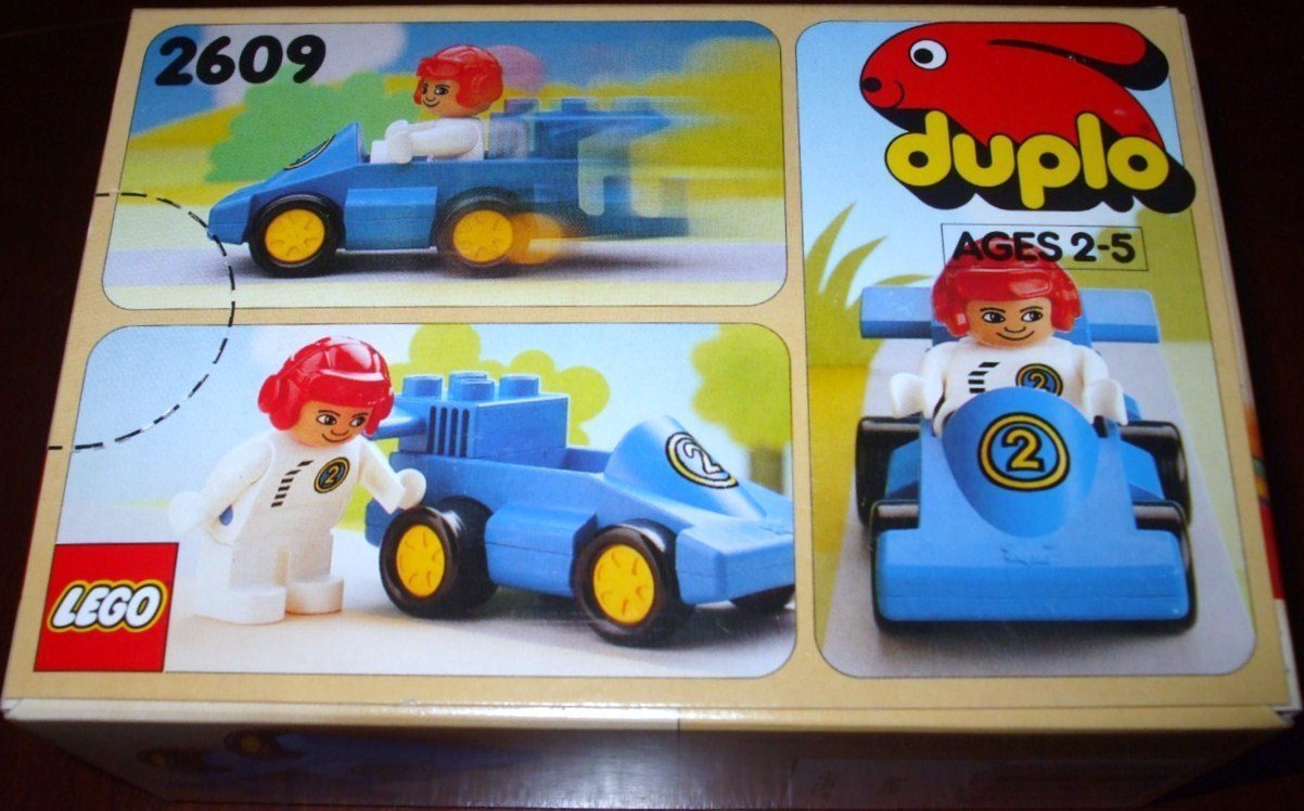 Duplo Car Formula One with Blue Bottom and Yellow Number 2 Pattern