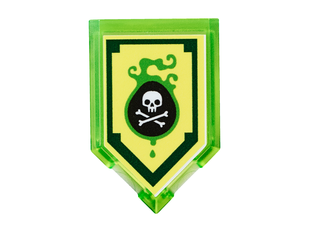 | 1 X Tile, Modified 2 x 3 Pentagonal with Nexo Power Shield Pattern - Venom Bite | Trans-Bright Green |   |  |